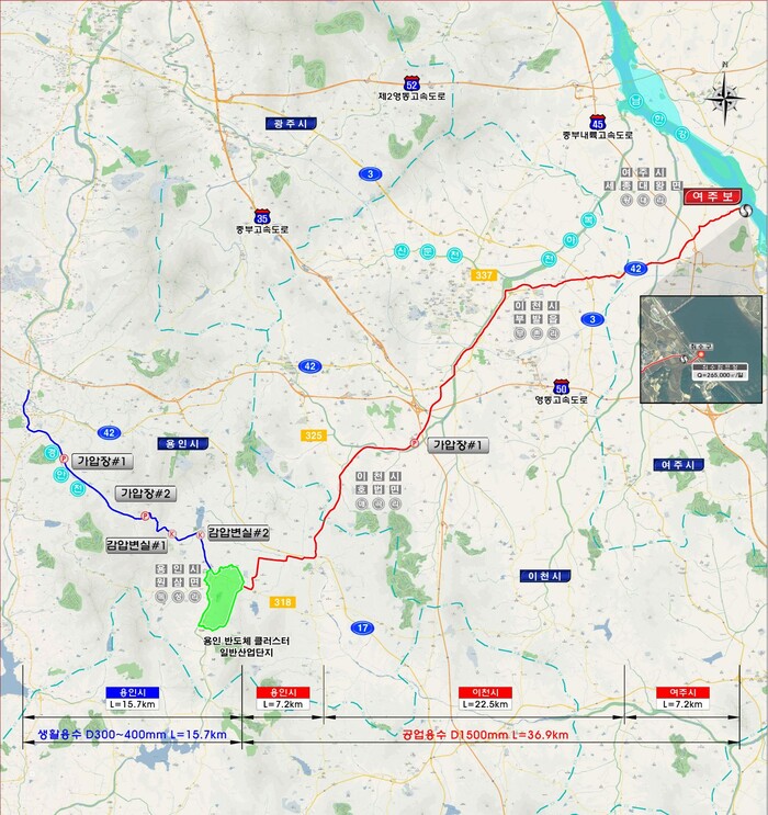 용인 반도체클러스터 공업용수는 하루 26만5000톤(1차분)이 공급된다. 공업용수가 이동하는 관로는 취수지점인 여주시 남한강 여주보에서 이천시를 거쳐 사업대상지까지 폭 1500㎜, 연장 36.9㎞로 설치된다.