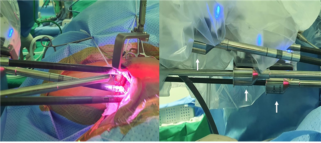 ▲4개의 로봇팔을 서로 충돌시키지 않는 방법으로 수술을 진행하는 모습 |