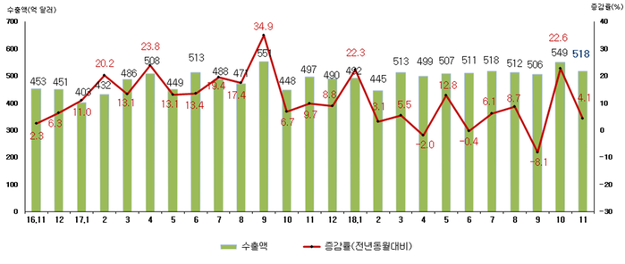 11월 수출 기록은 역대 4위에 오른 수출 실적으로 7개월 연속 500억 달러라는 고공행진을 이어가고 있다.