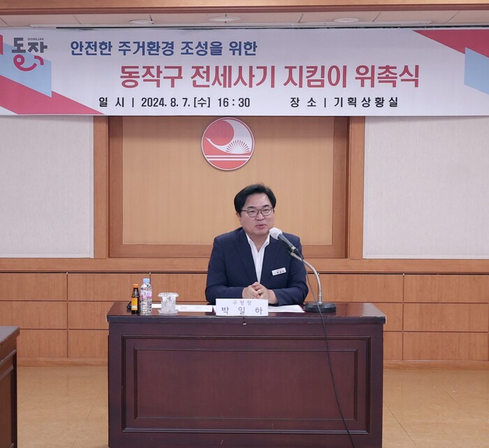 ▲ 박일하 동작구청장이 지난 7일 열린 동작구 전세사기 지킴이 위촉식에서 인사말을 하고 있다.(동작구 제공) |