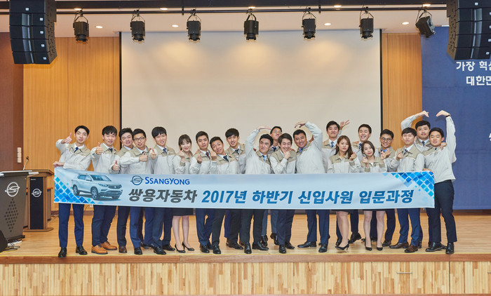 ▲2017 쌍용차 신입사원들이 지난달 27일 안성 인재개발원에서 열린 2017 신입사원 입문과정 수료식에서 환하게 웃으며 기념촬영을 하고 있다. |