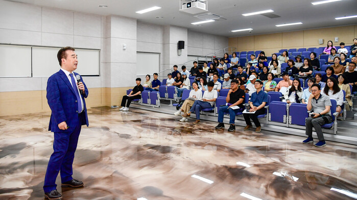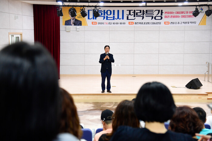 강원 화천군이 지난 6일 화천커뮤니티센터 공연장에서 대학입시 전략특강을 최문순 군수, 남윤곤 메가스터디 입시전략 연구소장을 비롯해 학생과 학부모들이 참석한 가운데 개최했다. 이날 특강에서는 2025~2027학년도 대입제도 변화, 2025년 대입 수시 및 정시전형 대비, 화천지역 학생 맞춤형 대입지원 전략 등이 소개됐다.(사진=화천군 제공)