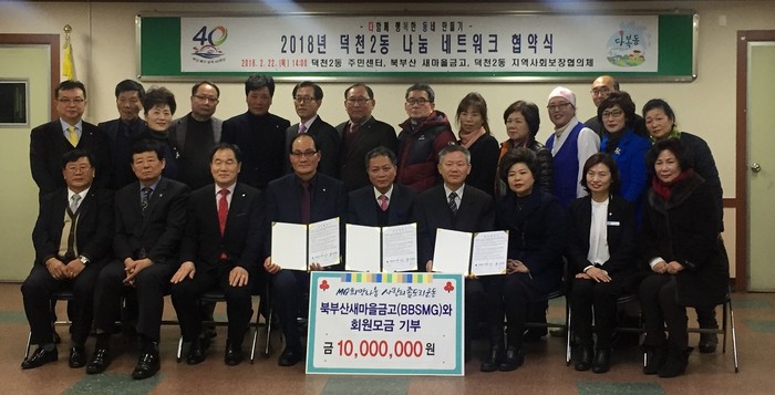 [로컬세계 맹화찬 기자]부산시 북구 덕천2동(동장 배수현)은 지난 22일 북부산새마을금고(이사장 박태익)와 나눔네트워크 협약식을 갖고 성금 1000만원을 기탁받았다.