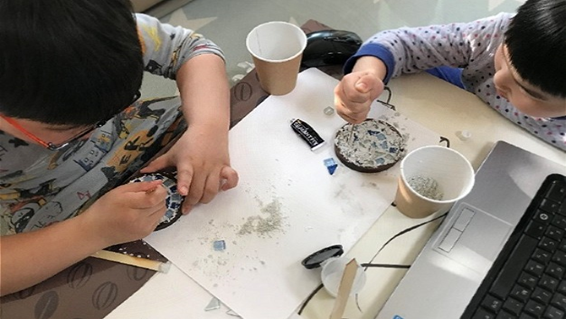 | ▲광동제약 직원 가족이 홈 아트클래스 키트를 활용해 작품을 만들고 있다. |