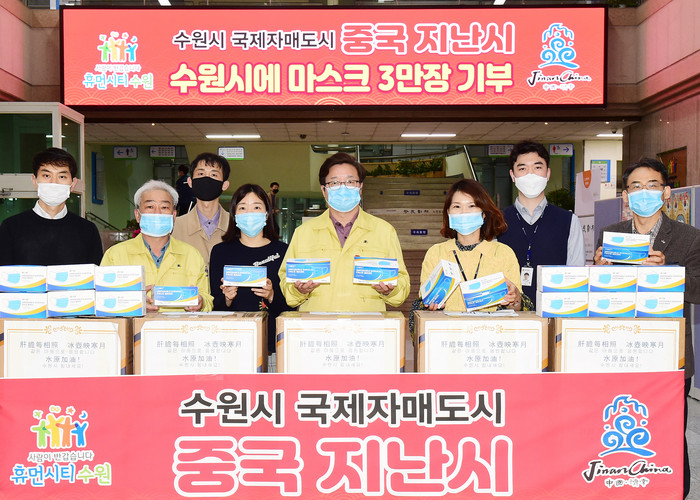 이날 지난시가 보낸 마스크 상자에는 ‘肝膽每相照 冰壶映寒月 水原加油!’(간담매상조 빙호영한월 수원가유!) 글이 적혀있었다. ‘肝膽每相照 冰壶映寒月’는 ‘서로 모든 것을 다 내어 보이는 깊은 사귐이 마치 옥주전자에 비친 차가운 달빛처럼 투명하구나’라는 뜻이다. ‘水原加油!’는 ‘수원시 힘내세요!’라는 의미다.