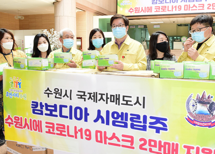 캄보디아 시엠립주 핀 프락(Pin Prakad) 부지사는 지난 20일 자로 염태영 수원시장에게 공식서한을 보내 “수원시의 코로나19 대응에 도움이 되도록 (수술용) 마스크 2만 매를 기부할 의향이 있다”고 밝혔고, 중국 지난시도 23일 “수원시에 수술용 마스크 3만 매를 제공하겠다”고 기부 의향을 밝힌 바 있다.