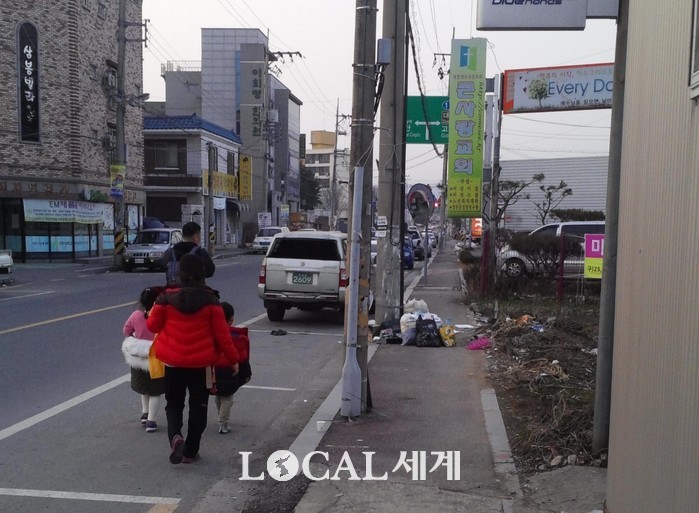 [로컬세계 유범수 기자]초등학교 근처 인도를 쓰레기가 점거해 차도로 다녀야 하는 통학길이 있다.