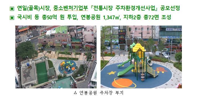 중소벤처기업부 전통시장 주차환경개선사업은 전통시장 주변 주차여건을 개선해 이용객과 주민들에게 안전하고 쾌적한 환경을 조성하는 사업으로, 서류심사와 현장평가 중기부 최종 심의를 거쳐 연일(골목)전통시장이 최종 선정됐다.