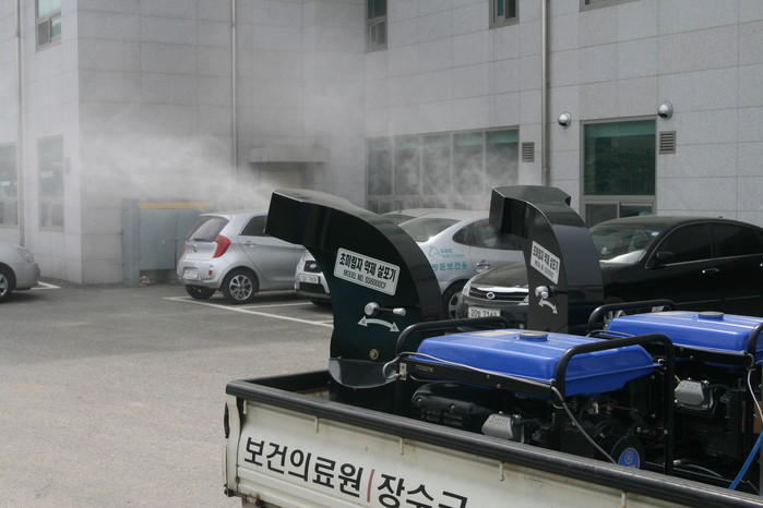 ▲장수군보건의료원 방역소독차에서 초미립자 약제가 살포되고 있다. |