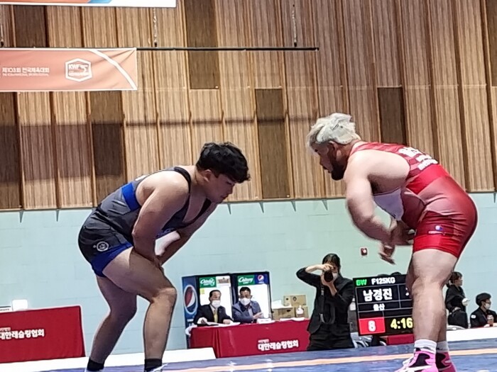▲ 자유형 125kg급 구로구 레슬링팀 기연준 선수(사진 왼쪽)가 울산광역시 남구청의 남경진 선수(사진 오른쪽)와 결승전을 펼치고 있다. 구로구 제공 |