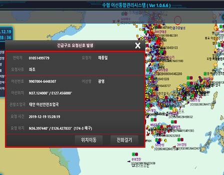 | ▲수협 '조업정보알리미' 앱에서 '구조요청'을 눌렀을 때 어선안전국의 '어선통합관리시스템'에 보이는 화면이다. |
