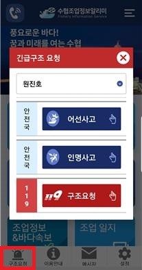 | ▲수협 '조업정보알리미' 앱에서 '구조요청'을 눌렀을 때 보이는 화면이다. |