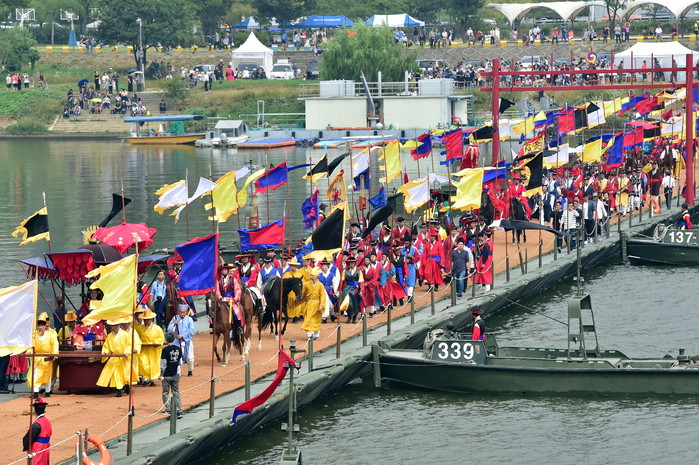 | ▲2017년 제54회 수원화성문화제에서 완벽 재현된 정조대왕 능행차 행렬이 한강을 건너고 있다.(수원시 제공) |
