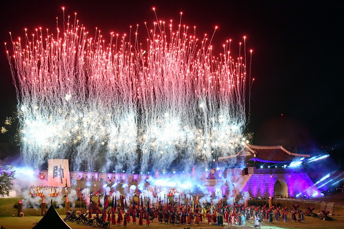 | ▲2019년 제56회 수원화성문화제 폐막연 무예 공연 ‘야조’ 공연 중 불꽃이 하늘을 수놓고 있다. |