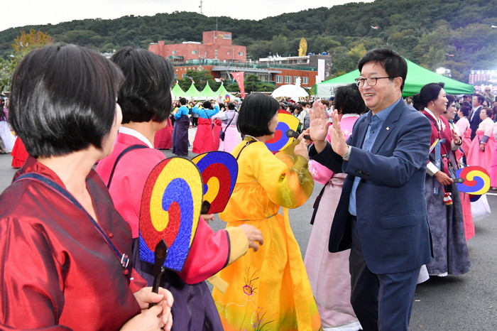 | ▲2019년 제56회 수원화성문화제에서 염태영 수원시장이 시민들과 함께 인사하고 있다. |