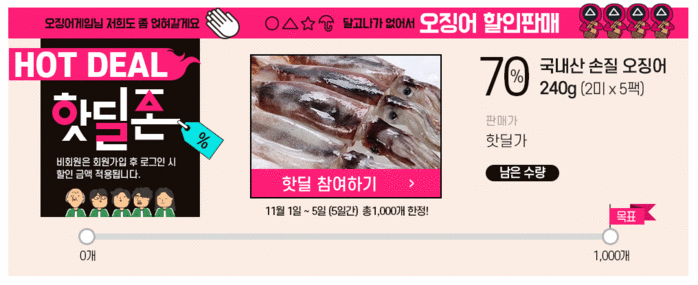 소비자가격 3만원인 ‘수협 촉촉 손질오징어(2미/240g×5팩)’에 수협 자체 할인과 정부에서 지원하는 ‘대한민국 수산대전’ 30% 할인(한도 2만원) 쿠폰을 적용하면 9,900원에 무료배송으로 구매할 수 있다.