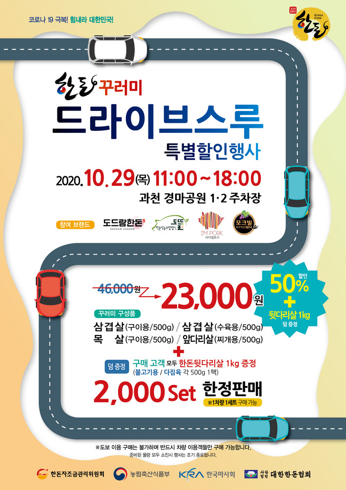 | ▲한돈자조금관리위원회는 한국마사회 후원으로 한돈 소비촉진을 위해 10월 29일(목)에 과천 경마공원 주차장에서 드라이브 스루를 활용한 ‘한돈꾸러미 드라이브스루 특별할인행사’를 실시한다고 밝혔다. |