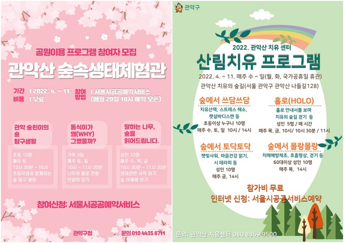 구관계자는 “코로나19로 지친 구민들이 관악산도시자연공원에서 제공하는 산림교육과 산림휴양 프로그램으로 심리적 안정감과 신체적 건강증진을 누리길 바란다”고 전했다.