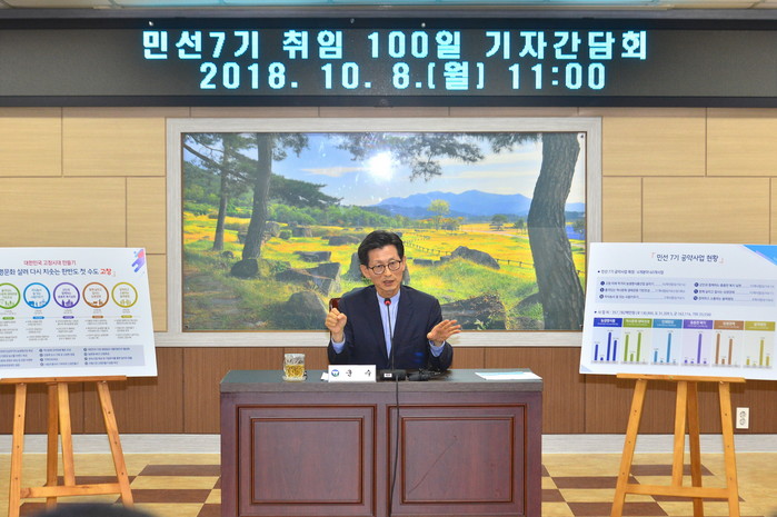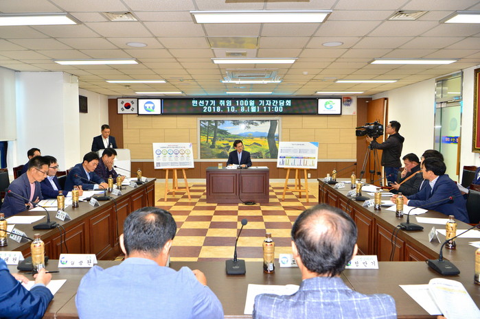 ▲유기상 군수가 지난 8일 군청 회의실에서 ‘민선 7기 출범 100일 기자 간담회’를 갖고 있다.(고창군 제공) |