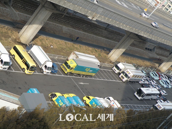 ▲지난 13일 서울시 정릉천 복개 공영주차장에 11톤 화물차 등 대형 차량이 주차돼 있다. ©로컬세계 |