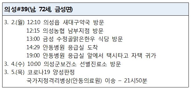 한편, 지난 4일 확진자로 밝혀진 관외-4 확진자(경산시 주소, 의성 실거주)의 배우자가 추가 확진자로 밝혀짐에 따라 의성군의 관내 확진자는 총 39명(완치 포함)이 됐으며, 이번에 추가된 의성-39(72,남,금성면) 확진자는 현재 안동의료원으로 이송돼 입원중이다.