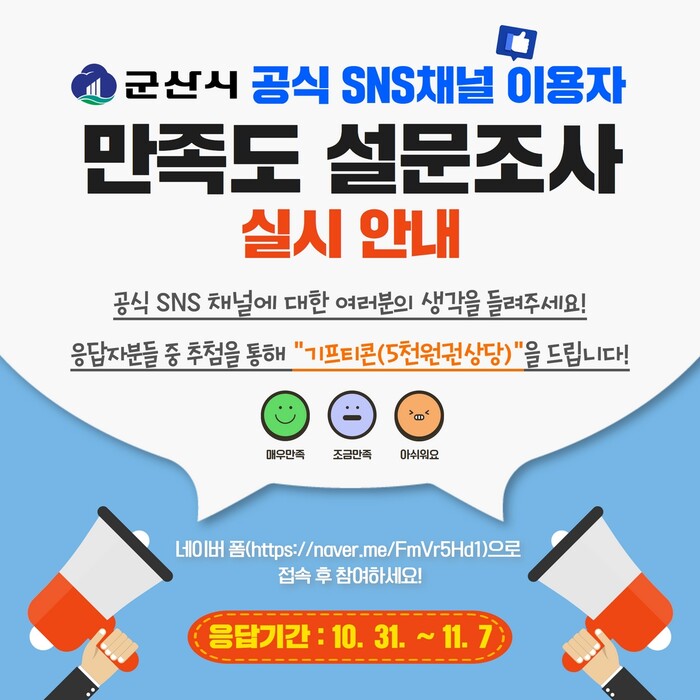 [로컬세계=양해수 기자]전북 군산시가 오는 31일부터 11월 7일까지 8일간 공식 SNS 채널 이용자들을 대상으로 알차고 유익한 SNS 운영을 위한 만족도 조사를 실시한다.