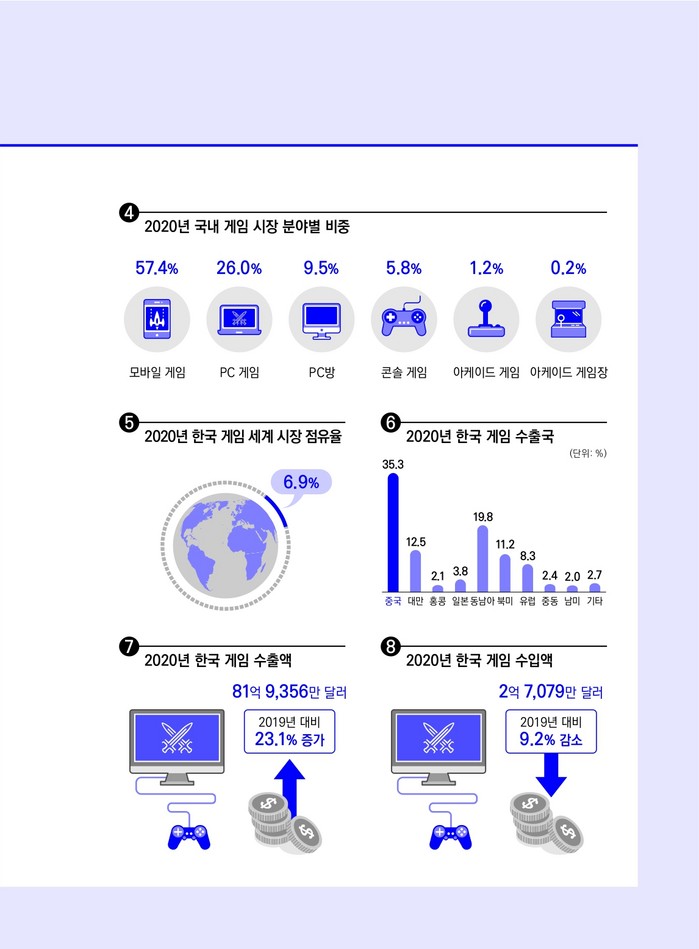 문화체육관광부와 한국콘텐츠진흥원(콘진원)은 2020년 국내외 게임산업의 통계와 동향을 정리한‘2021 대한민국 게임백서’를 발간했다.