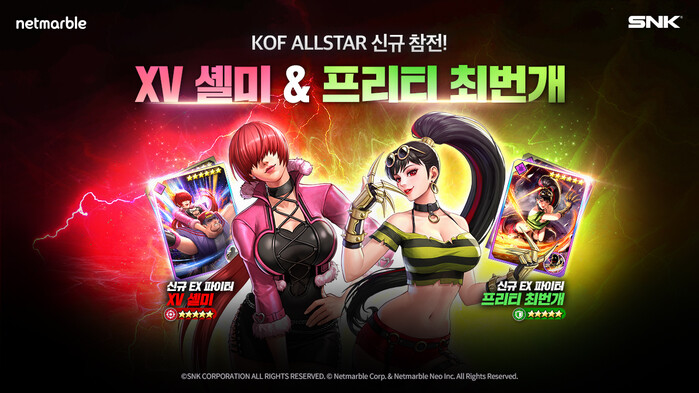넷마블(대표 권영식, 도기욱)은 액션 RPG ‘더 킹 오브 파이터즈 올스타(이하 킹 오브 파이터 올스타)’에 태생 EX 신규 파이터 ‘XV 셸미’와 ‘AS 프리티 최번개’를 추가하는 등 다양한 업데이트를 실시했다고 27일 밝혔다.