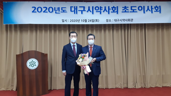 조재구 대구 남구청장이 지난 24일 대구시약사회관에서 열린 '2020년도 대구시약사회 초도이사회'에서 (사)대구광역시약사회(회장 조용일)로부터 감사패를 전달받았다.(사진=대구 남구청 제공)