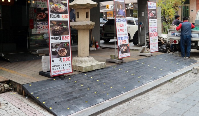 ‘장애인, 노인, 임산부 등의 편의증진 보장에 관한 법률’에 따르면 일정 규모 이상의 시설에는 경사로를 의무적으로 설치해야 한다. 하지만 구민들이 자주 이용하는 오래된 아파트, 식당, 슈퍼, 약국 같은 소규모 생활시설은 법적 의무사항이 아닌 곳이 대부분이라 경사로가 없는 곳이 많다.