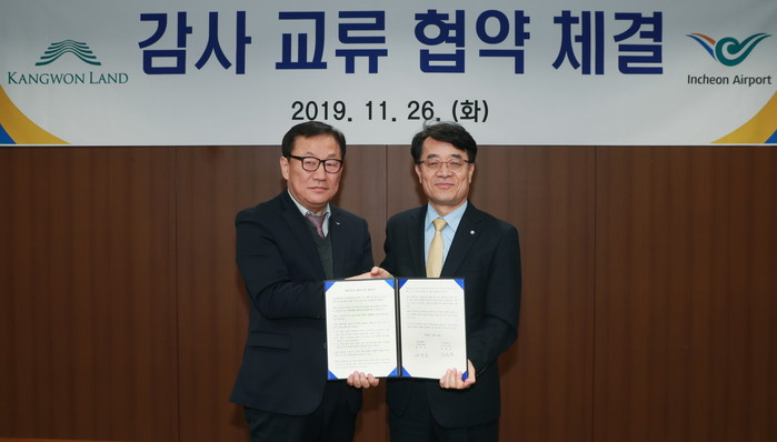 26일 오후 4시, 인천국제공항공사 회의실에서 진행된 협약식에는 강원랜드 송석두 상임감사위원과 인천공항공사 김길성 상임감사위원을 비롯해 양 기관의 감사실・팀장 및 주요 관계자 10여 명이 참석했다.