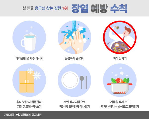 장염 예방을 위해서는 적당한 양의 음식 섭취와 철저한 위생관리가 중요하다. 문정락 과장은 “장염은 일반인과 아이들에게도 모두 발병할 수 있어서 설 명절 기간 꼼꼼한 손 위생과 함께 과식을 삼가고 개인 접시를 사용하여 본인이 먹는 양을 확인하면서 식사하는 것이 도움이 된다”고 말했다.