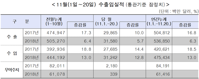 | ▲11월 1~20일 수출입실적.(관세청 제공) |