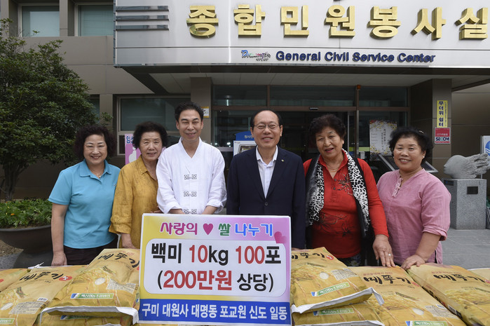 이날 전달식에는 구미 대원사 대명동 포교원 노훈기 원장이 참석했으며, 전해진 백미는 관내 저소득 주민들에게 전해질 예정이다.