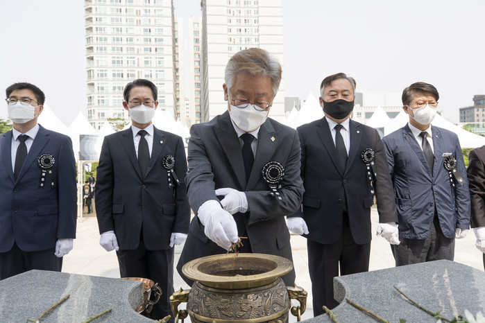 | ▲6일 이재명 지사가 제65회 현충일을 맞아 수원 현충탑에서 분향을 하고 있다.(경기도 제공) |