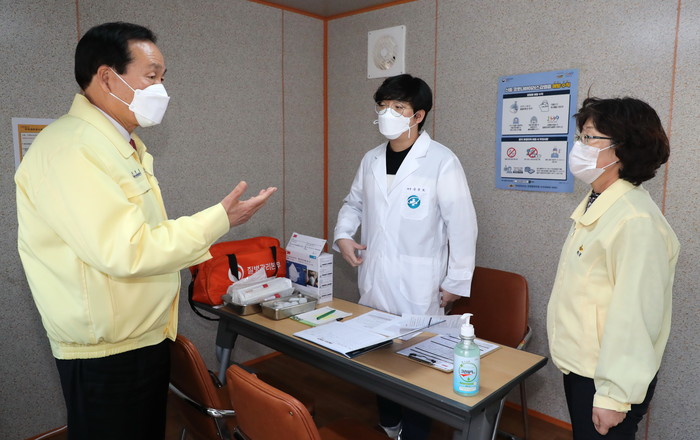 | ▲선별진료소에 방문한 김주수군수.(의성군 제공) |