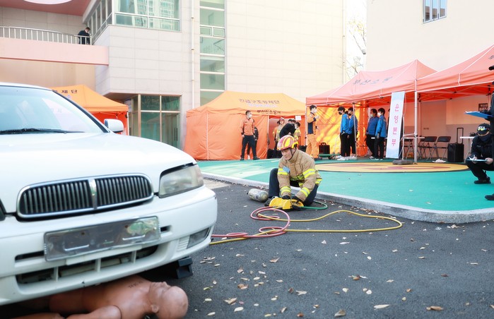 11개 소방서의 진압・구조・구급・운전 분야 최우수 대원 44명은 강풍주의보가 내려진 궂은 날씨에도 최선을 다해 그동안 갈고닦은 실력을 겨뤘다.