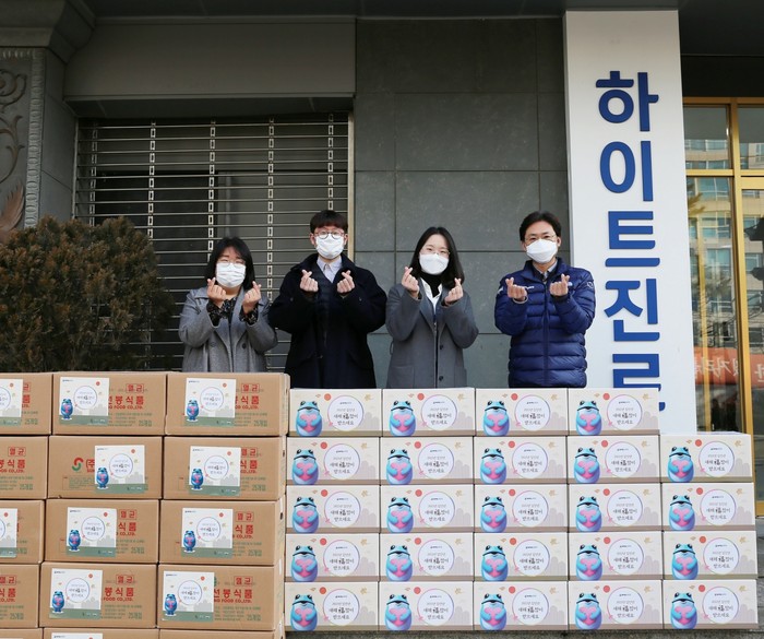 | ▲하이트진로는 설맞이 명절 음식 나눔을 위해 24일 하이트진로 서초사옥 앞에서 최소 인원만 참석해 전달식을 진행했다. 양평군종합사회복지관, 은행종합사회복지관 사회복지사들과 하이트진로 정세영 수석팀장(오른쪽 첫번째). |
