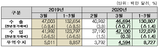 관세청은 3월 한달간 수출이 전년 동월 대비 0.7% 감소한 467억 달러를 기록했다. 수입은 0.3% 증가한 421억 달러, 무역흑자 46억 달러로 2012년 2월 이후 98개월 연속 흑자를 달성했다고 16일 밝혔다.