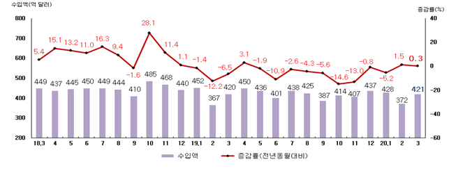 | ▲월별 수입액 및 증감률 추이- 전년 동월 대비 0.3% 증가한 421억 달러 기록. |