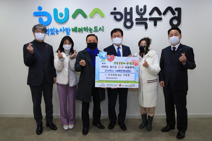 [로컬세계 박세환 기자]대구 수성구는 지난 18일 ㈜한국전설(대표 구진모)과 세바퀴봉사단(단장 김영애)에서 관내 어려운 이웃들을 위해 써달라며 제주농장에서 직접 수확한 신선한 제주감귤 210박스(400만원 상당)를 구청에 전달했다고 21일 밝혔다.