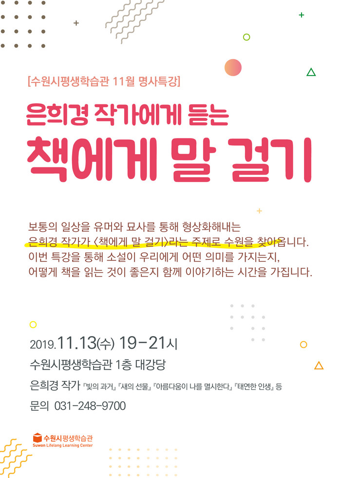 수원시평생학습관 홈페이지 ‘평생학습관 강좌’에서 신청하거나 평생학습관 1층 반딧불이 상담실을 방문해 신청하면 된다. 무료 강연이다.