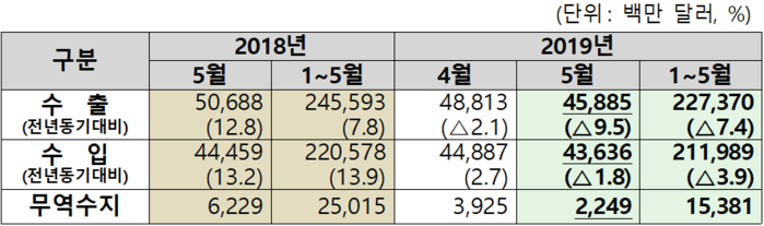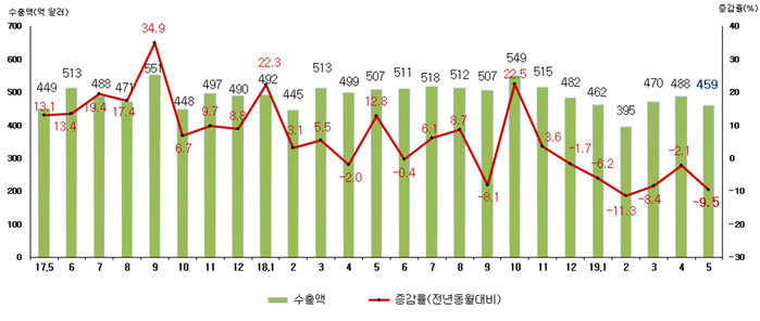 17일 관세청이 발표한 ‘5월 월간 수출입 현황(확정치)’에 따르면 전년 동월 대비 수출은 9.5% 감소한 459억 달러, 수입은 1.8% 감소한 436억 달러로 무역흑자 22억 달러를 기록해 2012년 2월 이후 88개월 연속 흑자를 달성했다고 밝혔다.