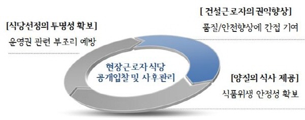 그동안 건설현장 근로자 식당의 운영은 관리·감독의 사각지대에 있는 경우가 많았다. 시공사에서 수의계약으로 건설현장근로자식당을 설치·운영해 오는 등 식당 운영권을 둘러싼 부조리한 관행이 만연했다.