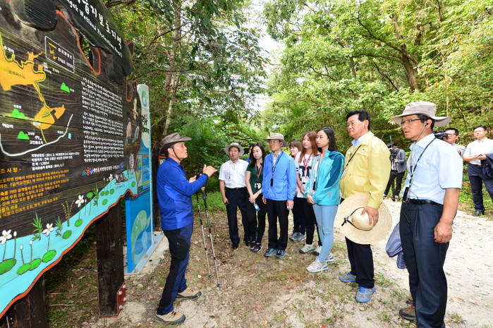 ▲박우정 고창군수(오른쪽 두 번째)과 관광객들이 문화관광해설사로부터 운곡습지에 대해 설명을 듣고 있다. ©로컬세계 |