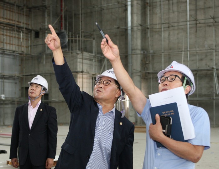 ▲서울시 마포구의회 이동주 행정건설위원장(가운데)이 마포구민체육센터 건립현장을 방문해 관계자로부터 공사현황에 대해 설명을 듣고 있다. |