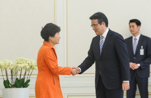 ▲ 박근혜 대통령이 지난 3일 청와대에서 오카다 하츠야 일본 민주당 대표와 인사하고 있다.<사진출처=청와대 홈페이지> |