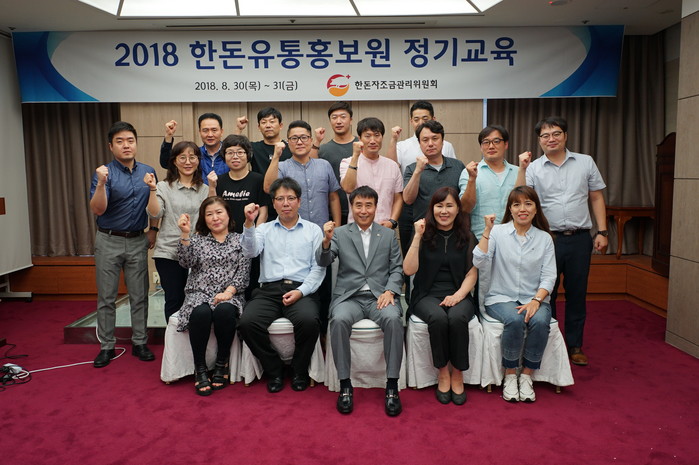 ▲한돈자조금은 8월 30~31일 대전에 위치한 계룡스파텔 을지홀에서 ‘2018 한돈유통홍보원 정기교육’을 개최했다.(앞줄 왼쪽부터 한돈 유통홍보원 대전충남지역 이영숙, 한돈자조금 인증사업부 박순철 부장, 한돈자조금 하태식 위원장, 한돈 유통홍보원 대구경북지역 임순희, 제주지역 양정혜)/(한돈자조금 제공) |