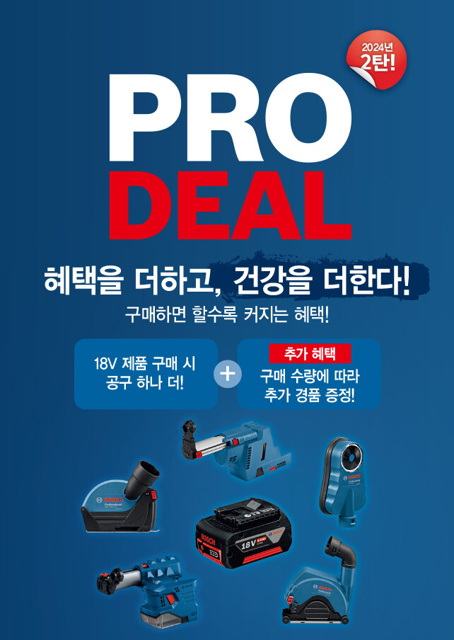 새롭게 진행하는 ‘보쉬 프로딜’ 2탄은 28만 원 이상(단품 기준)의 보쉬 전문가용 전동공구 18V 베어툴 혹은 키트를 구매한 고객 전원에게 100% 경품을 제공한다. 경품은 △충전 해머 집진기 GDE 18V-16 베어툴 △충전 해머 집진기 GDE 18V-12 베어툴 △그라인더용 집진기(5인치) GDE 125 EA-T 베어툴 △충전 해머 집진기 GDE 115/125 FC-T 베어툴 △해머용 집진기(흡착형) GDE 68 △배터리팩 18V 5.0Ah 중 한 가지를 골라 받을 수 있다.