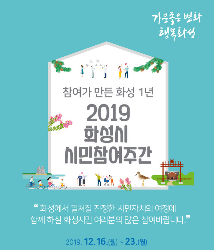 [로컬세계 고용주 기자]경기 화성시가 진정한 지방자치 실현을 위해 1년 동안 걸어왔던 과정을 공유하기 위해 16일부터 23일까지 ‘참여가 만든 화성1년’을 주제로 ‘시민참여주간’을 운영한다고 밝혔다.